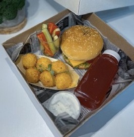 Состав: Картофельные шарики, Бургер(котлеты из куриного филе, лист салата, слайс из соленного огурца, плавленый сыр, помидор), соус с греческим йогуртом, овощные стики (перец болгарский и свежий огурец), компот.