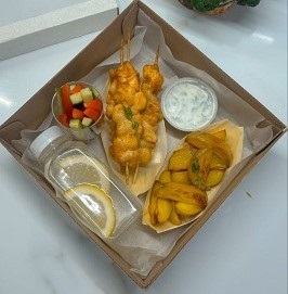 Состав: Шашлык(филе индейки или курочки по желанию), картофель по-деревенски, соус с греческим йогуртом, овощные стики( перец болгарский и свежий огурец), компот или вода с лимоном.