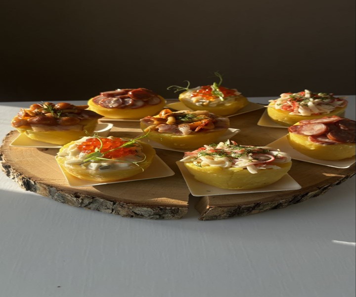 Состав: 1) картофель, баварские колбаски. 2) картофель, солёный огурец, отварное яйцо, икра. 3) картофель, крабовые палочки. 4) картофель, бекон, опята, лук